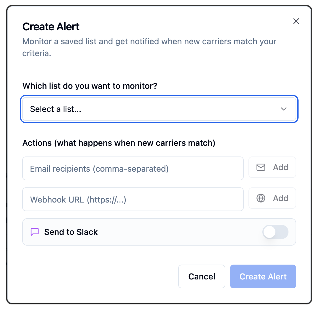 Set up monitoring on any saved list. Get notified when carriers match new conditions, risk signals change, or new carriers enter your target criteria.