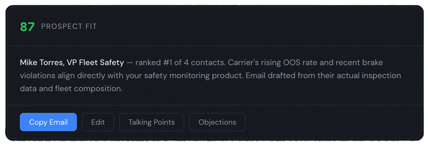 For any carrier you get a prospect fit score, ranked contacts with reasons, pre-written emails built from real carrier data, talking points for calls, and objection handling with suggested responses. Edit the emails inline and copy or send.