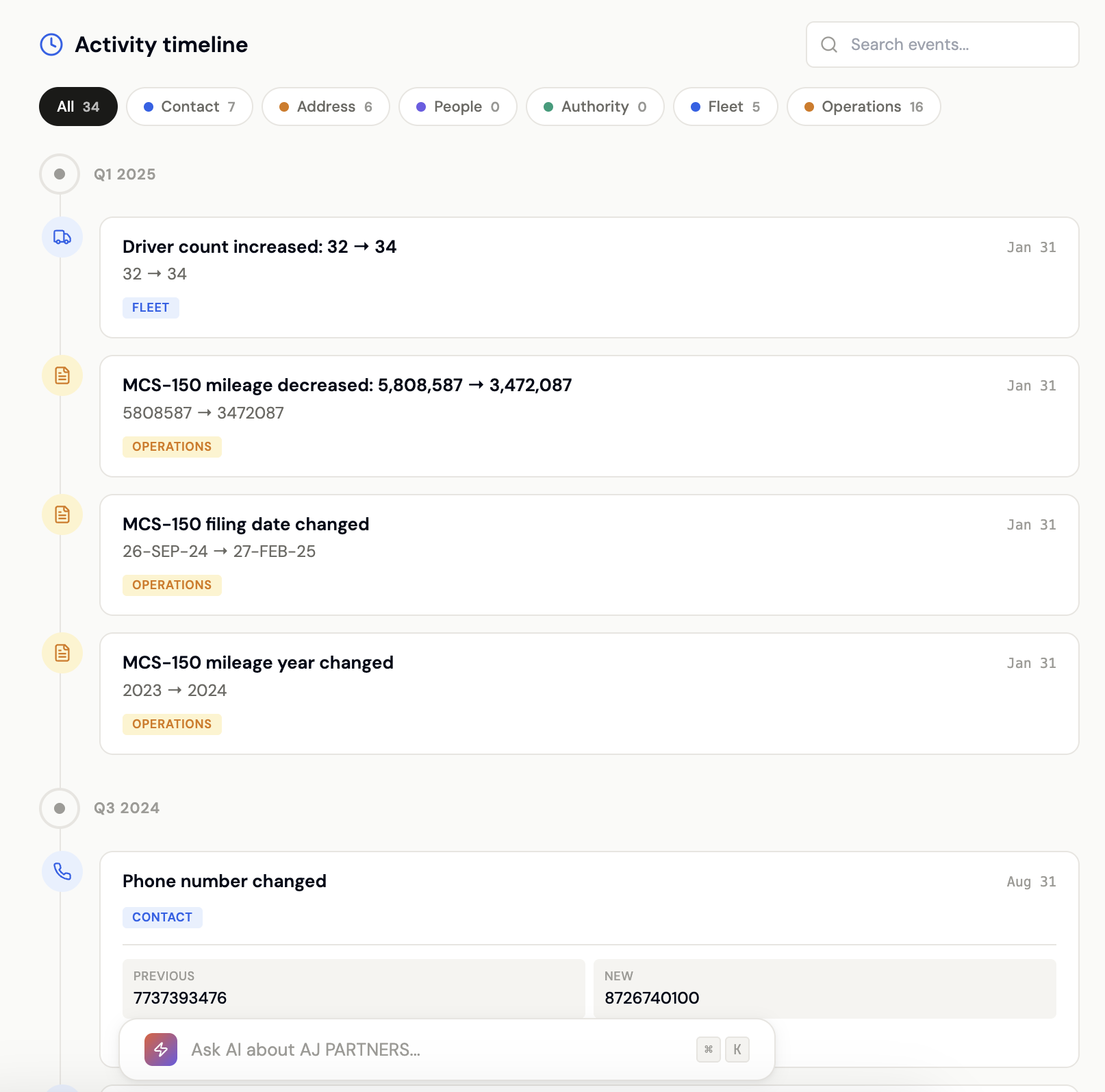 Easily view key changes in a carrier's corporate identity over time: phone numbers, company officers, addresses, and more. Spot patterns that signal instability, fraud risk, or ownership changes at a glance.